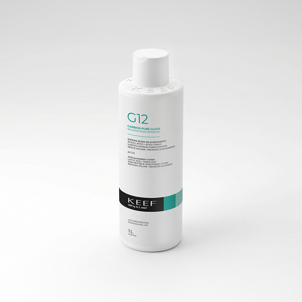O G12 Carbon Pure Gloss é um sistema de alinhamento ácido desenvolvido para reduzir o volume e proporcionar alinhamento da fibra capilar. Sua fórmula contém ácido lático, ácido tânico e manteiga de karité, que auxiliam na reorganização da estrutura dos fios, proporcionando brilho intenso, maciez e redução de frizz.