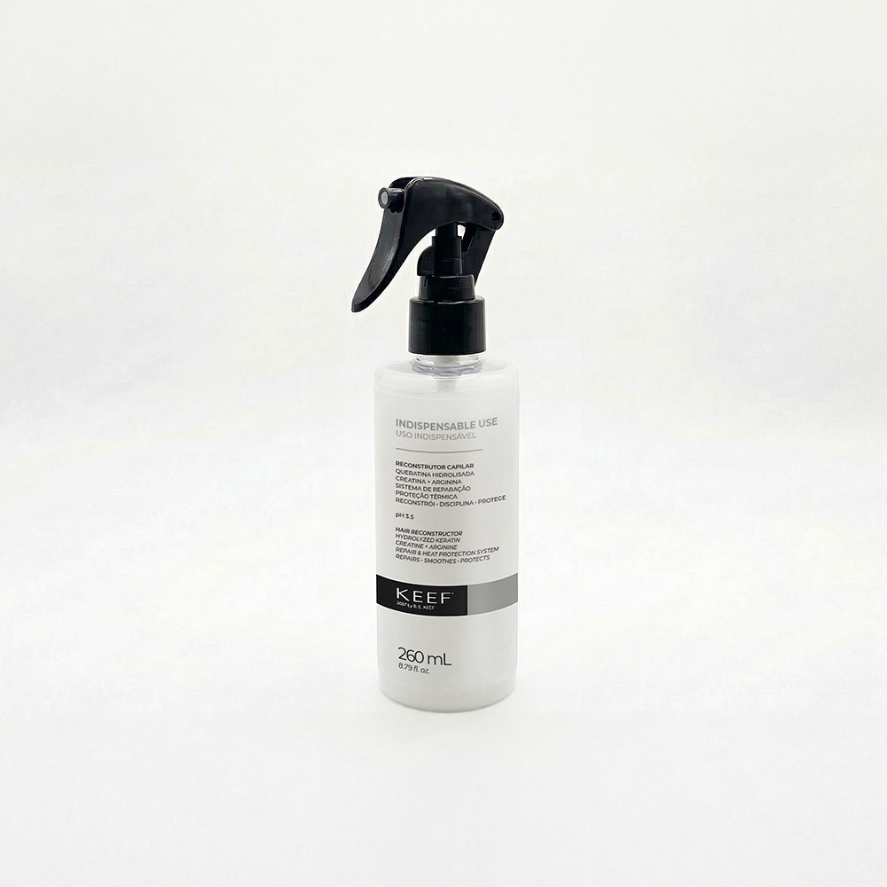 O Reconstrutor Capilar Uso Indispensável KEEF recupera o aspecto saudável do cabelo danificado e quimicamente tratado. Sua fórmula com Queratina Hidrolisada, Creatina e Arginina auxilia na reconstrução da fibra capilar, disciplinando os fios, protegendo do calor do secador e ajudando a prevenir a formação de pontas duplas. Proporciona brilho, maciez e alinhamento sem sobrecarga.